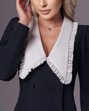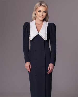 This dress features a detachable decorative white collar that adds a touch of elegance. It has slightly puffed, long sleeves and highlights the silhouette with its knee-length design. The front is adorned with five decorative buttons arranged in two lines, adding a charming detail to the ensemble.