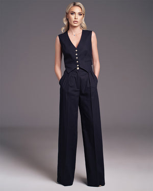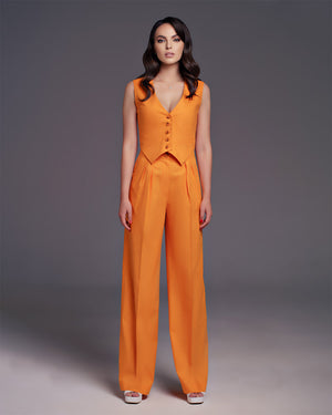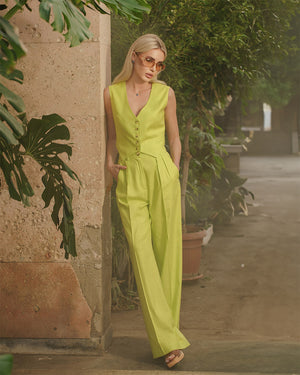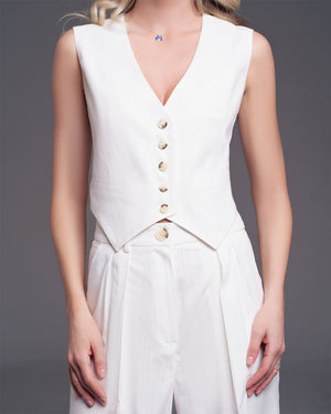 Crafted from a blend of 80% cotton and 20% linen, this sleeveless classic jacket exudes timeless elegance. It features a V-cut neckline and a five-button front closure, offering a sophisticated silhouette. The adjustable waistline with two back straps adds versatility to the design.