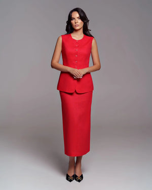 تجمع هذه المجموعة المكونة من قطعتين من الكتان بين الأناقة الخالدة والراحة القابلة للتنفس. يتميز الجزء العلوي بدون أكمام بظلية منظمة مع رقبة مستديرة وإغلاق بأزرار، مما يخلق مظهرًا مصقولًا وبسيطًا. عند إقرانها مع تنورة ميدي عالية الخصر متطابقة، توفر هذه المجموعة لمسة من الأناقة، مثالية للمناسبات في الطقس الدافئ أو الإعدادات المهنية. يضمن نسيج الكتان الطبيعي إحساسًا خفيف الوزن مع الحفاظ على مظهر أنيق ومفصل.