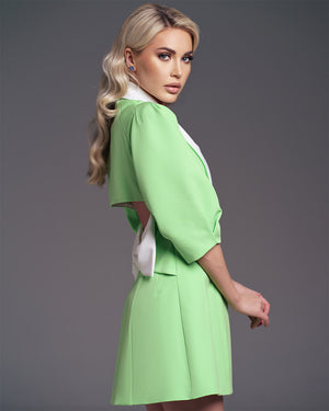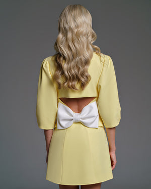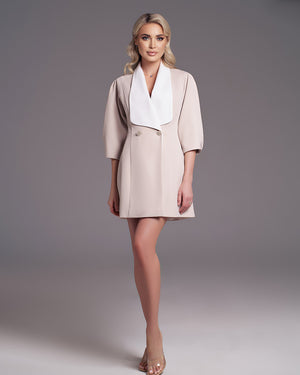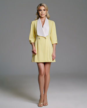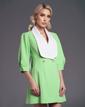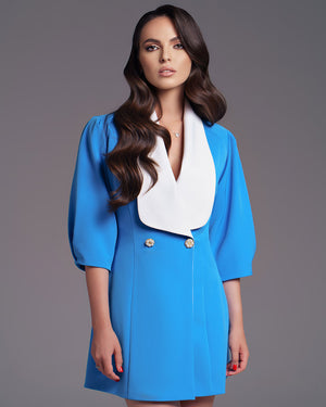 This dress combines sophistication with charm, featuring slightly puffed half-length sleeves and two decorative metallic buttons in front. It boasts a wide decorative white collar around the V-cut neckline, adding a chic touch. A small cut at the back reveals a hint of skin, accentuated by an added white bow. With a closure style reminiscent of a jacket, this dress offers both style and comfort.