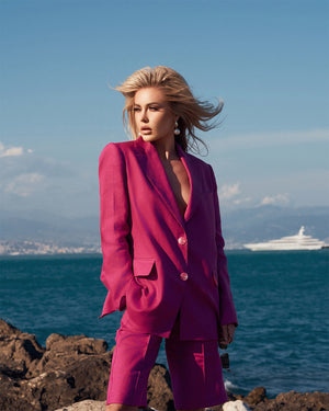 Crafted from linen with a cotton lining, this oversized jacket features a back cut and is adorned with three buttons. It offers a versatile and stylish addition to any wardrobe.