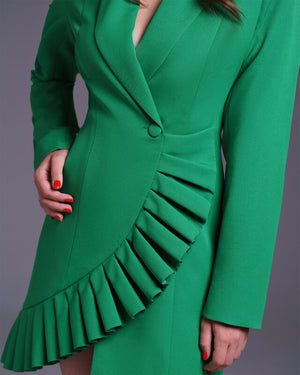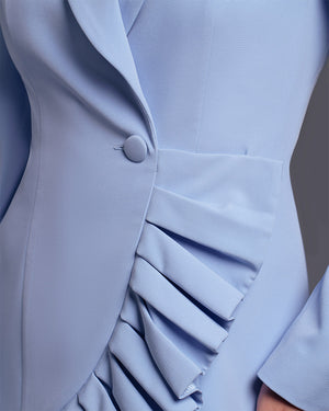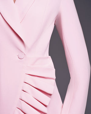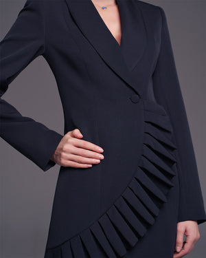 This short jacket-like dress features an asymmetrical design, adding a modern twist to a classic silhouette. With long classic sleeves and a short V-cut neckline, it strikes the perfect balance between sophistication and style. Adorned with one decorative button made from the same material, it also has creases on one part of the skirt, extending up to the waist, creating a sleek and tailored look.