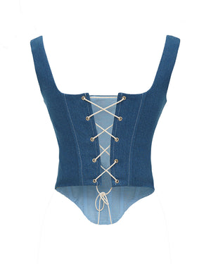 Crafted from durable denim fabric, this corset features thick straps and built-in shape for silhouette enhancement. Decorative vertical white sewing lines add flair, while the classic corset closure ensures a secure fit.