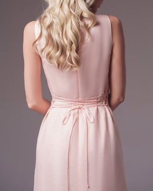 This sleeveless linen maxi dress features decorative cuts in the front, adding a unique touch to its design. With two deep cuts in the skirt, it offers a glimpse of the legs for a playful yet elegant look. The back is adjustable with a material-covered strap, allowing for a customizable fit and ensuring comfort throughout wear.