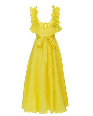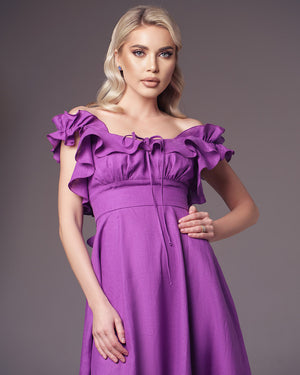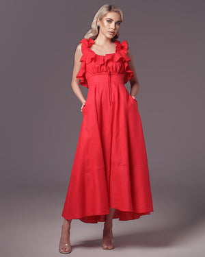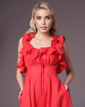 Crafted from luxurious linen, this dress boasts a built-in waist-highlighting belt, delicate ruffles, and small creases for texture. Practical pockets add functionality. Perfect for any occasion with its elegant maxi length.