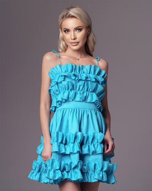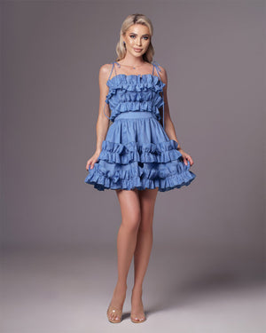 This mini dress exudes playful elegance with its dynamic design. Two lines of ruffles adorn the top part, adding movement and charm. The ruffles continue onto the skirt, creating a cohesive and eye-catching look. Thin straps delicately support the dress, enhancing its feminine silhouette. The waist is highlighted, adding definition and flattering your figure. The dress is made from breathable linen fabric.