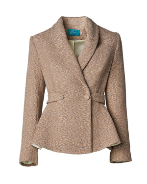 Elevate your wardrobe with our classic and elegant beige suit jacket. This timeless piece features a sophisticated silhouette with a flattering incorporate belt, two buttons in front and ruffle as a main decorative element. Pair it with the matching skirt for a complete and polished look.